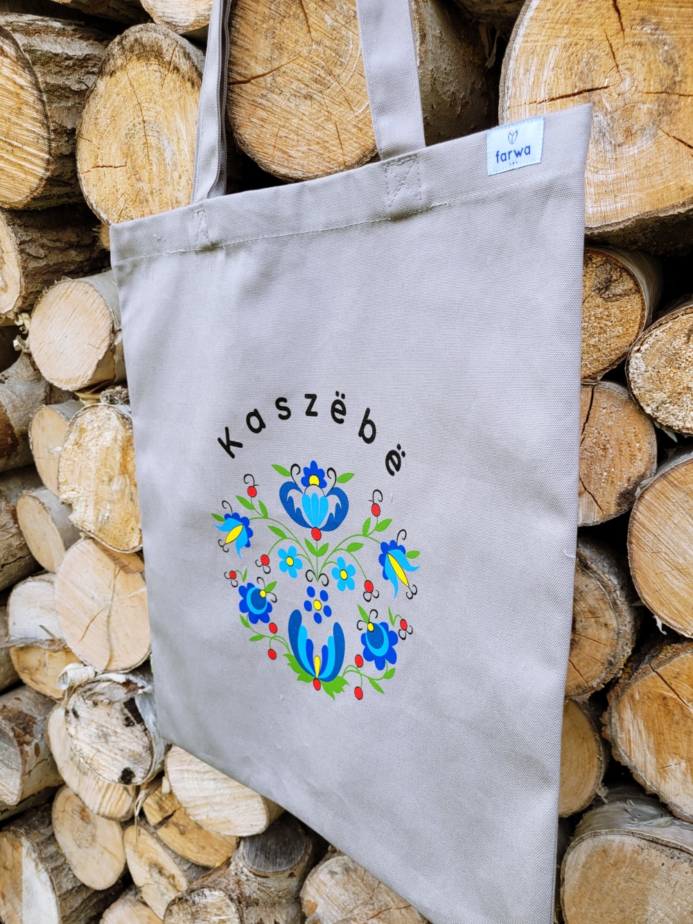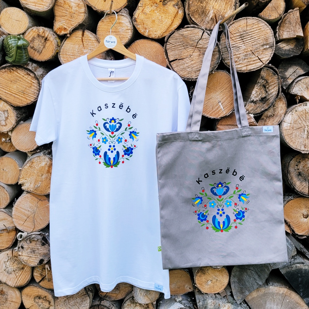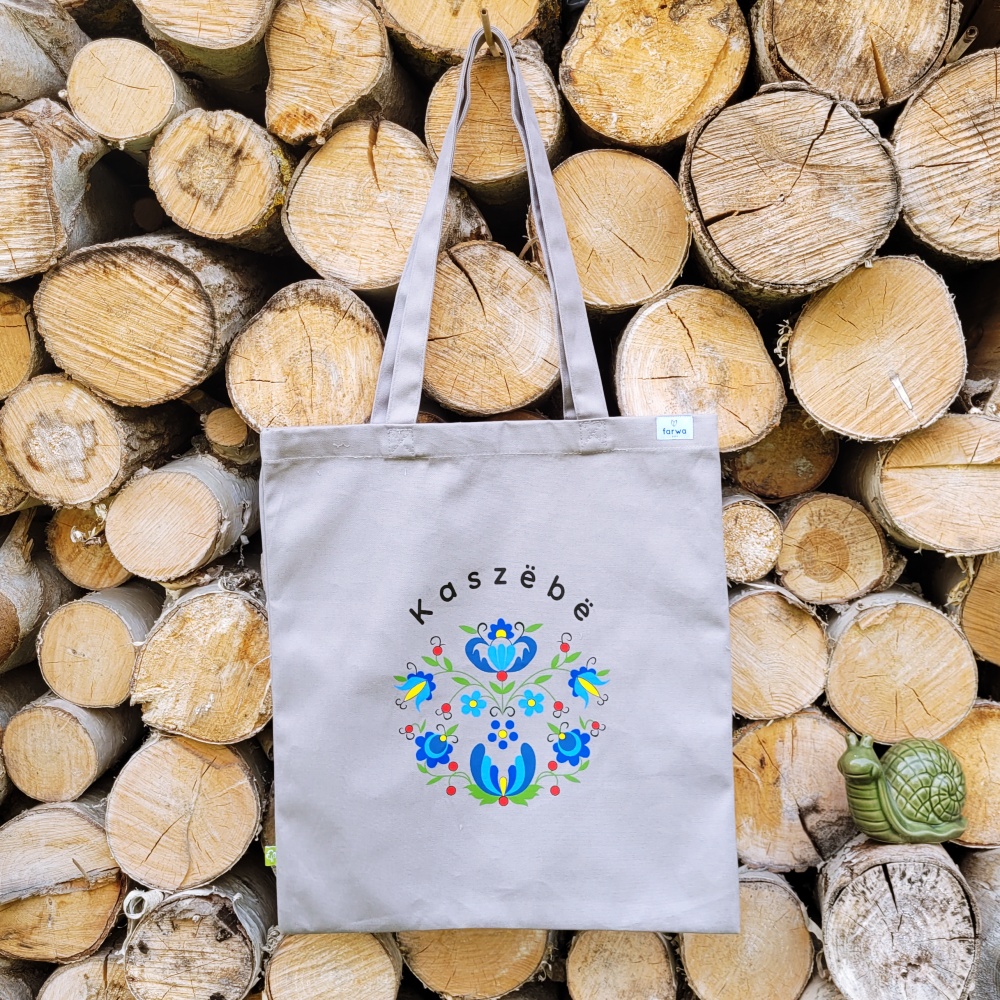 - Torba ze wyjątkowym wzorem inspirowanym tradycyjnym haftem kaszubskim. Centralnym elementem jest motyw kaszubski wkomponowany w koło, uzupełniony napisem „Kaszëbë” – Kaszuby, który podkreśla dumę i tożsamość regionalną.