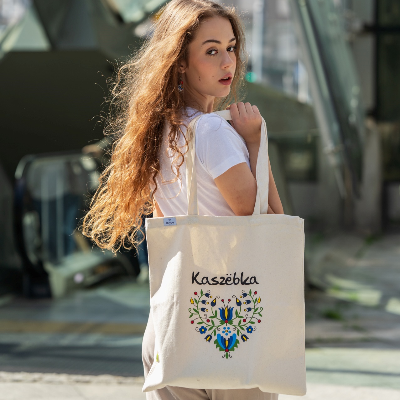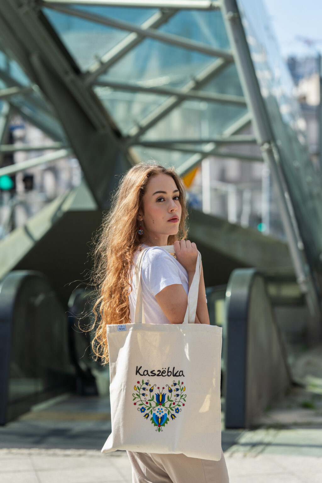- Torba z grafiką wzorami kaszubskimi wkomponowanymi w serce oraz „Kaszëbka: – z napisami w języku kaszubskim – Kaszubka.