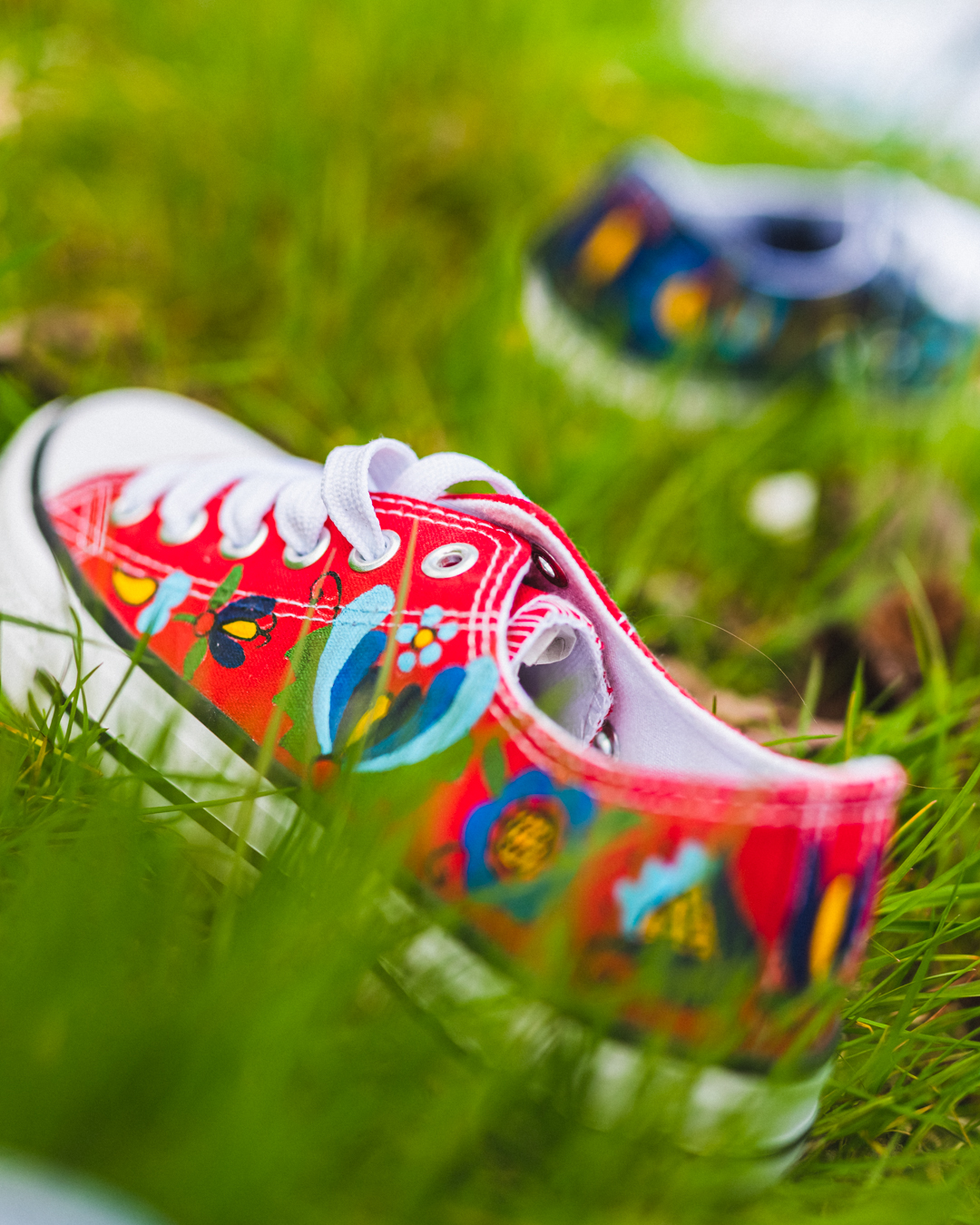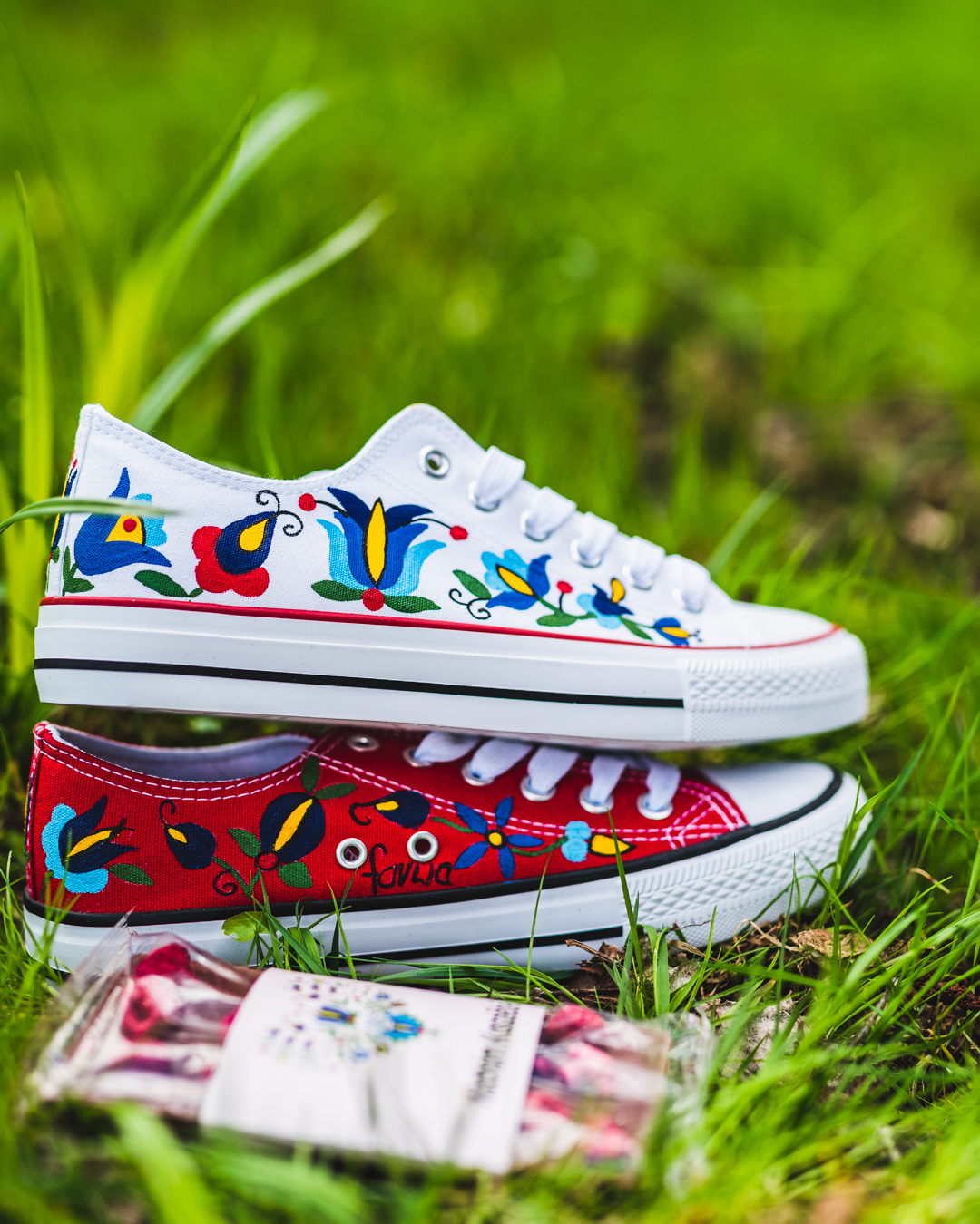 Wyjątkowe trampki w intensywnej czerwieni, zdobione ręcznie malowanymi wzorami haftu kaszubskiego we wzory żukowskie. Do wykonania zdobień użyto specjalnych farb do tkanin, dzięki czemu wzory są trwałe i odporne na użytkowanie.