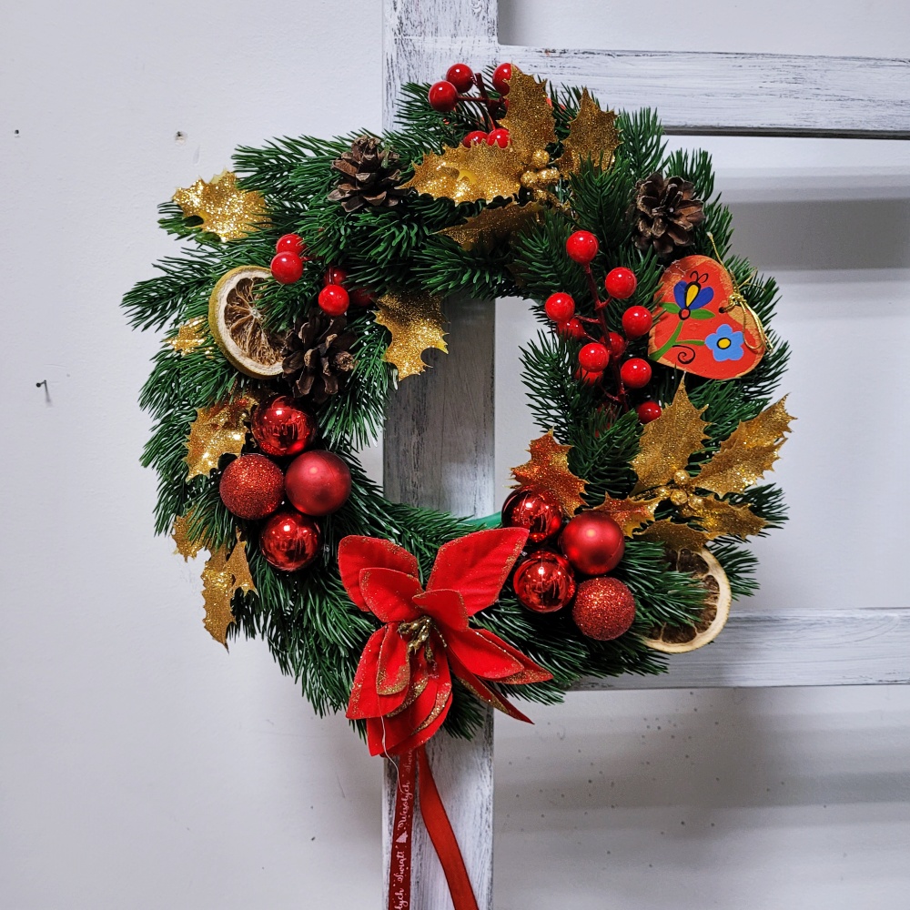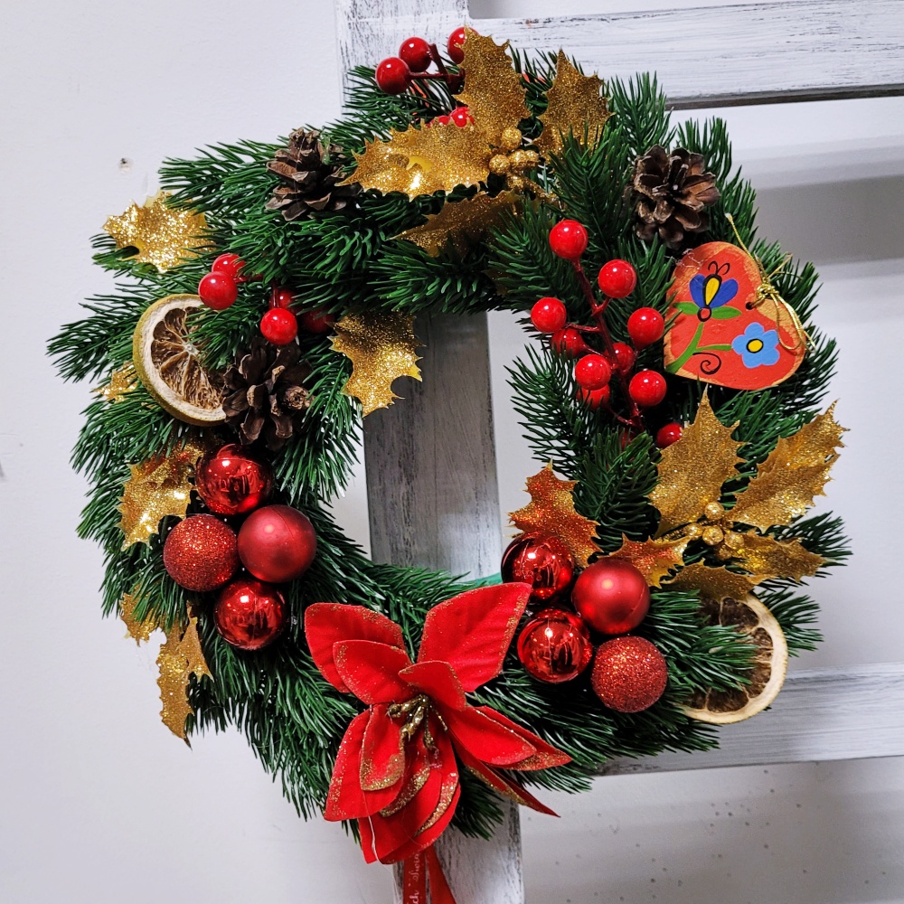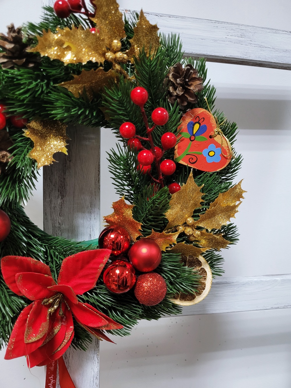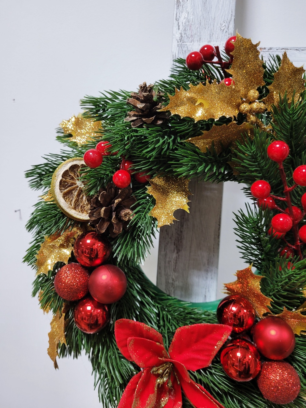 Stroik świąteczny czerwony o średnicy 25 cm to klasyczna kompozycja, która nada Twojemu wnętrzu wyjątkowy, świąteczny klimat. Gęste zielone gałązki, urozmaicone czerwonymi jagodami, gwiazdą betlejemską, plastikowymi czerwonymi bombkami, suszonymi plastrami pomarańczy i złotymi listkami ostrokrzewu – tworzą piękną ozdobę, idealną na świąteczne dni. Doskonale komponuje się z różnymi stylami dekoracji, wnosząc do wnętrza elegancję i ciepło.