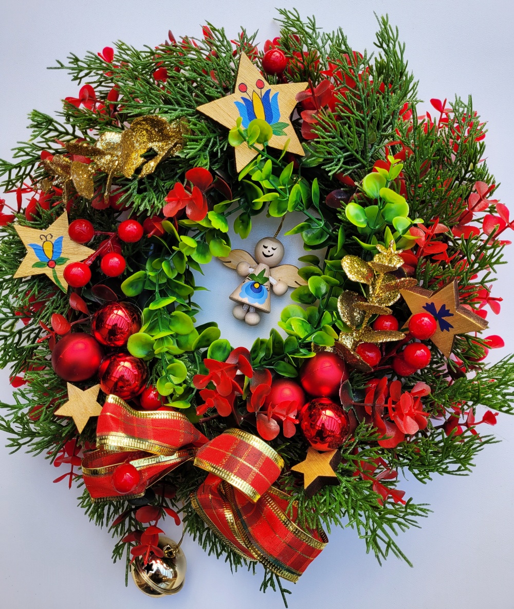 - gwiazdki i aniołek na wianku z ręcznie malowanymi wzorami kaszubskimi