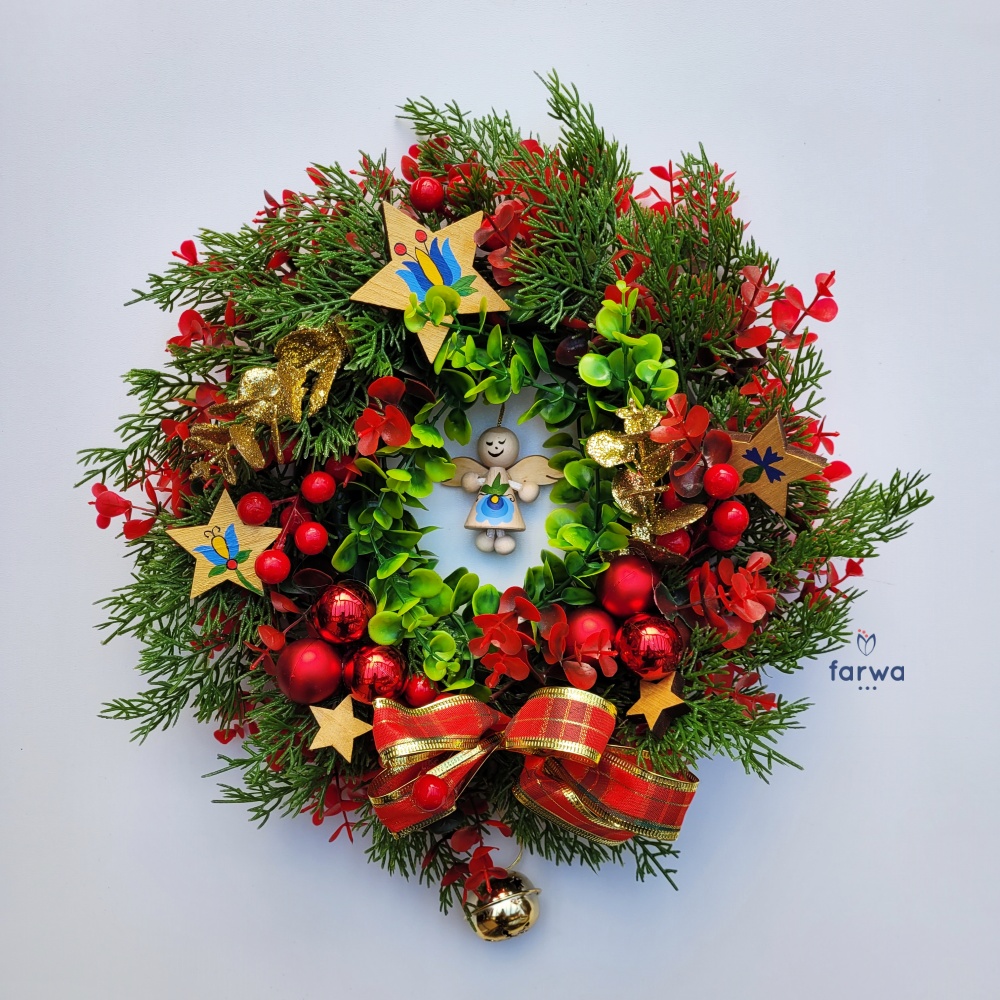 Stroik świąteczny czerwony o średnicy 25 cm to klasyczna kompozycja, która nada Twojemu wnętrzu wyjątkowy, świąteczny klimat. Gęste zielone gałązki, urozmaicone czerwonymi jagodami, gwiazdą betlejemską, plastikowymi czerwonymi bombkami, suszonymi plastrami pomarańczy i złotymi listkami ostrokrzewu – tworzą piękną ozdobę, idealną na świąteczne dni. Doskonale komponuje się z różnymi stylami dekoracji, wnosząc do wnętrza elegancję i ciepło.