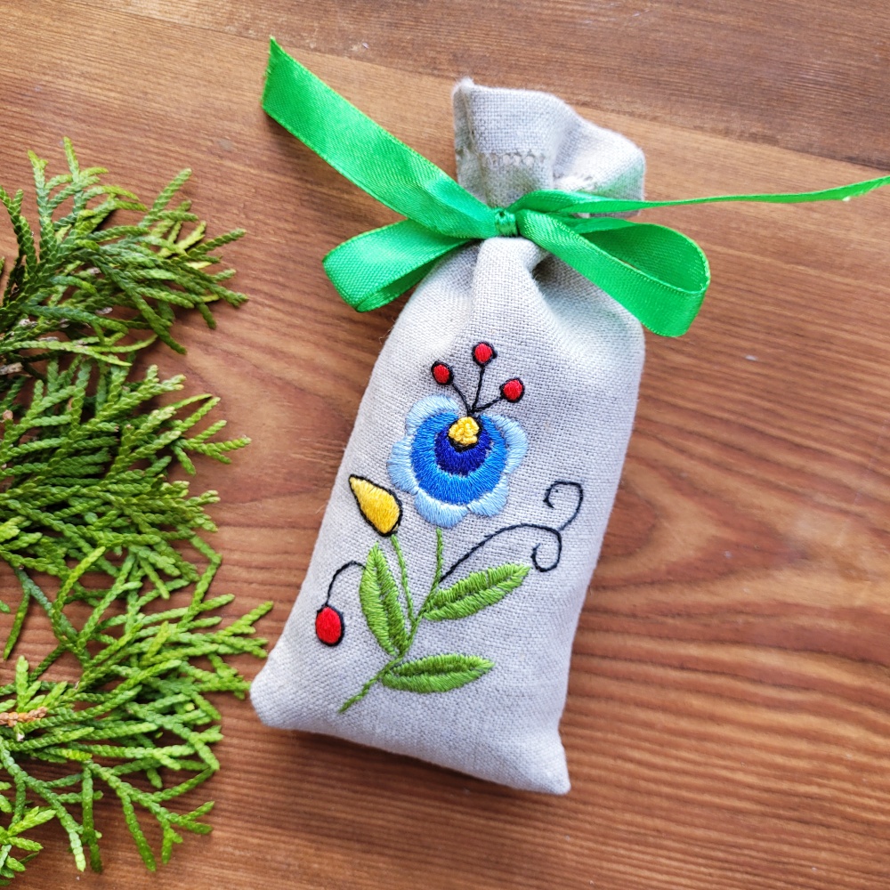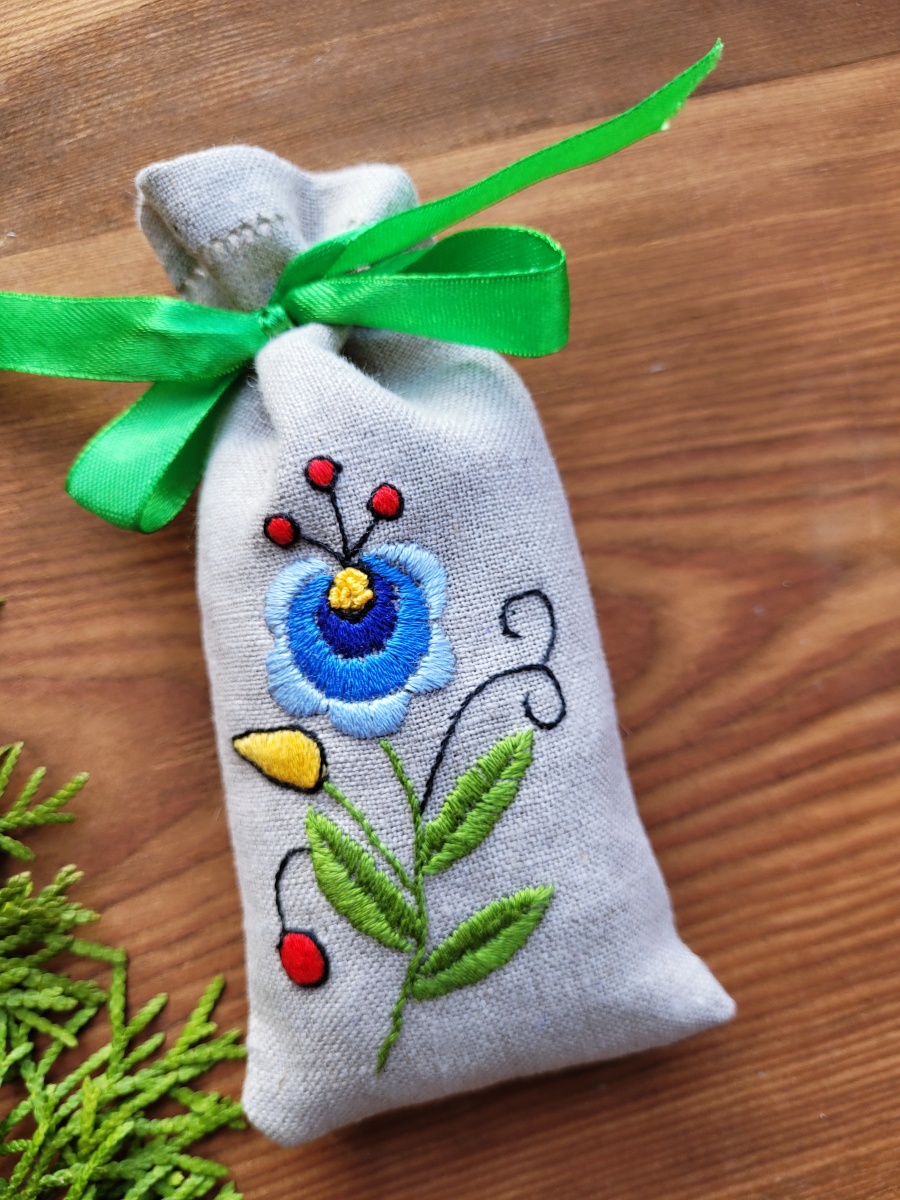 Naturalny lniany woreczek wypełniony suszoną lawendą, ozdobiony ręcznie wykonanym haftem kaszubskim. Delikatny, tradycyjny wzór nadaje mu regionalny charakter, a naturalny zapach lawendy wprowadza atmosferę spokoju i świeżości.
