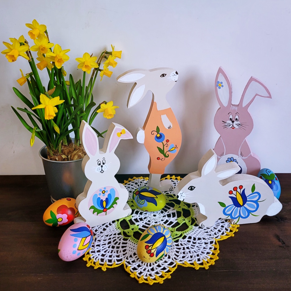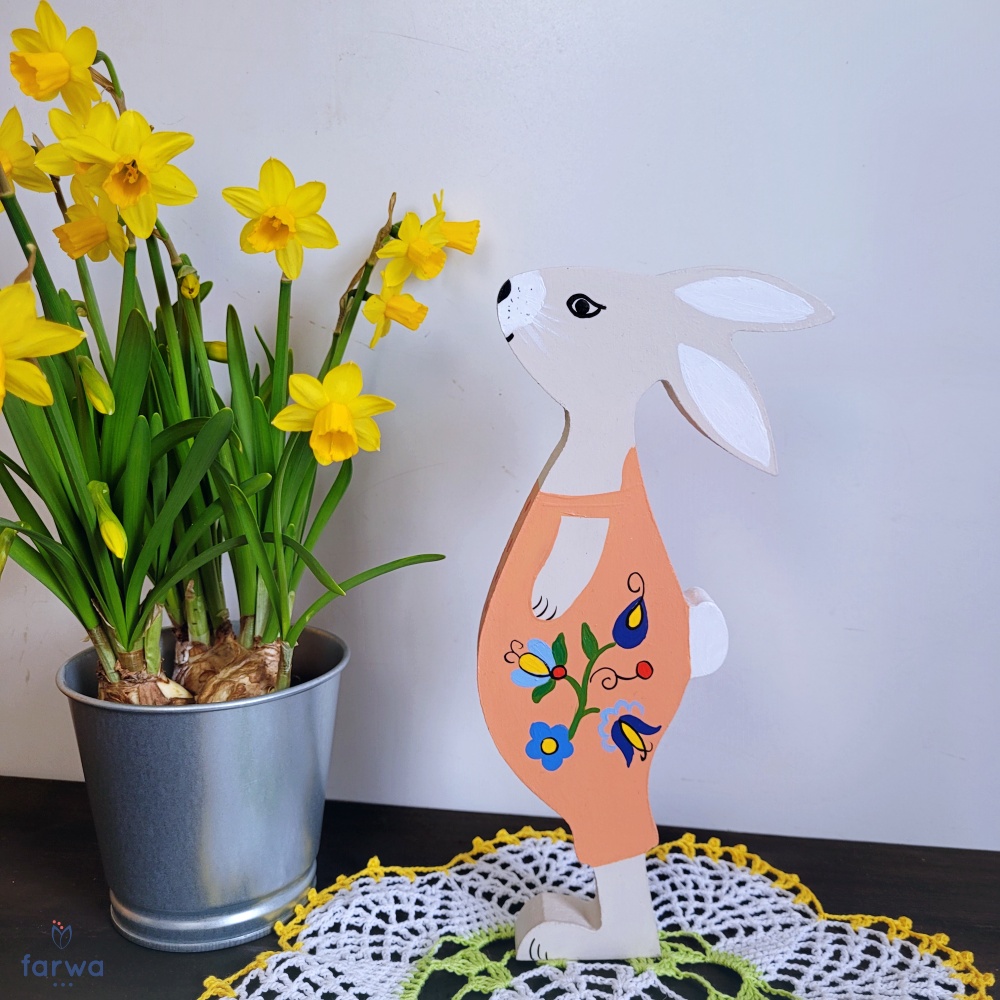 Zając wykonany jest z drewna o grubości 18 mm, dzięki czemu jest stabilny i samodzielnie stoi. Całość została ręcznie malowana z obu stron, a spodnie ozdobione są kaszubskimi wzorami, które nadają dekoracji unikatowego charakteru.
