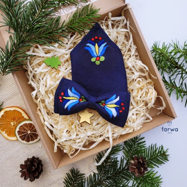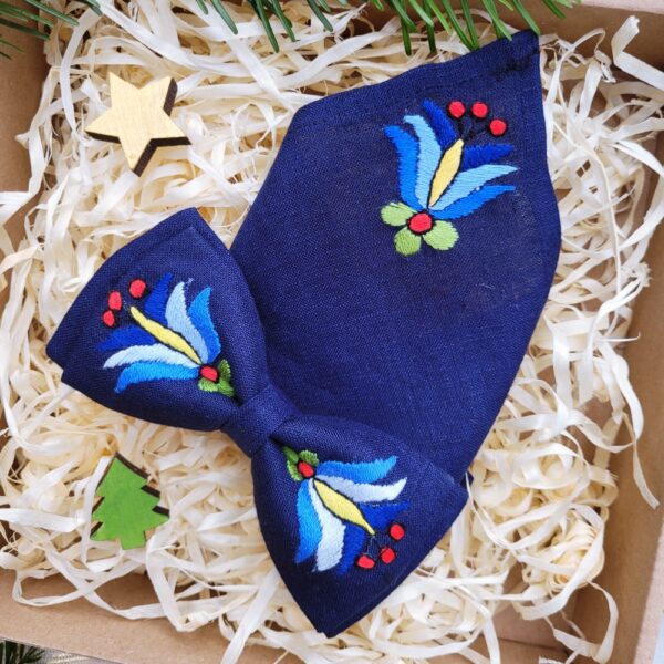 Elegancki zestaw składający się z lnianej muszki oraz poszetki dla dorosłego, zdobionych ręcznym haftem kaszubskim w stylu szkoły wejherowskiej. Każdy element został starannie wykonany, dzięki czemu cały komplet prezentuje się wyjątkowo i podkreśla regionalny charakter.