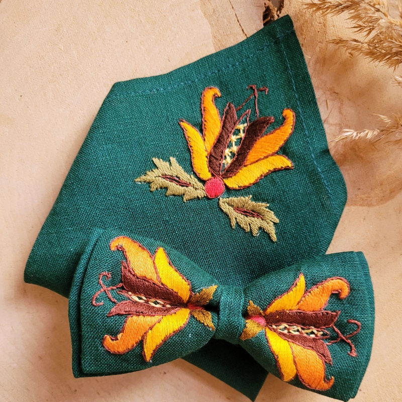 Elegancki zestaw składający się z lnianej muszki oraz poszetki, zdobionych ręcznym haftem kaszubskim w stylu szkoły Borowiackiej. Każdy element został starannie wykonany, dzięki czemu cały komplet prezentuje się wyjątkowo i podkreśla regionalny charakter.