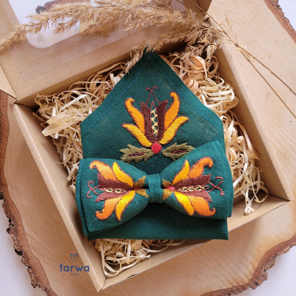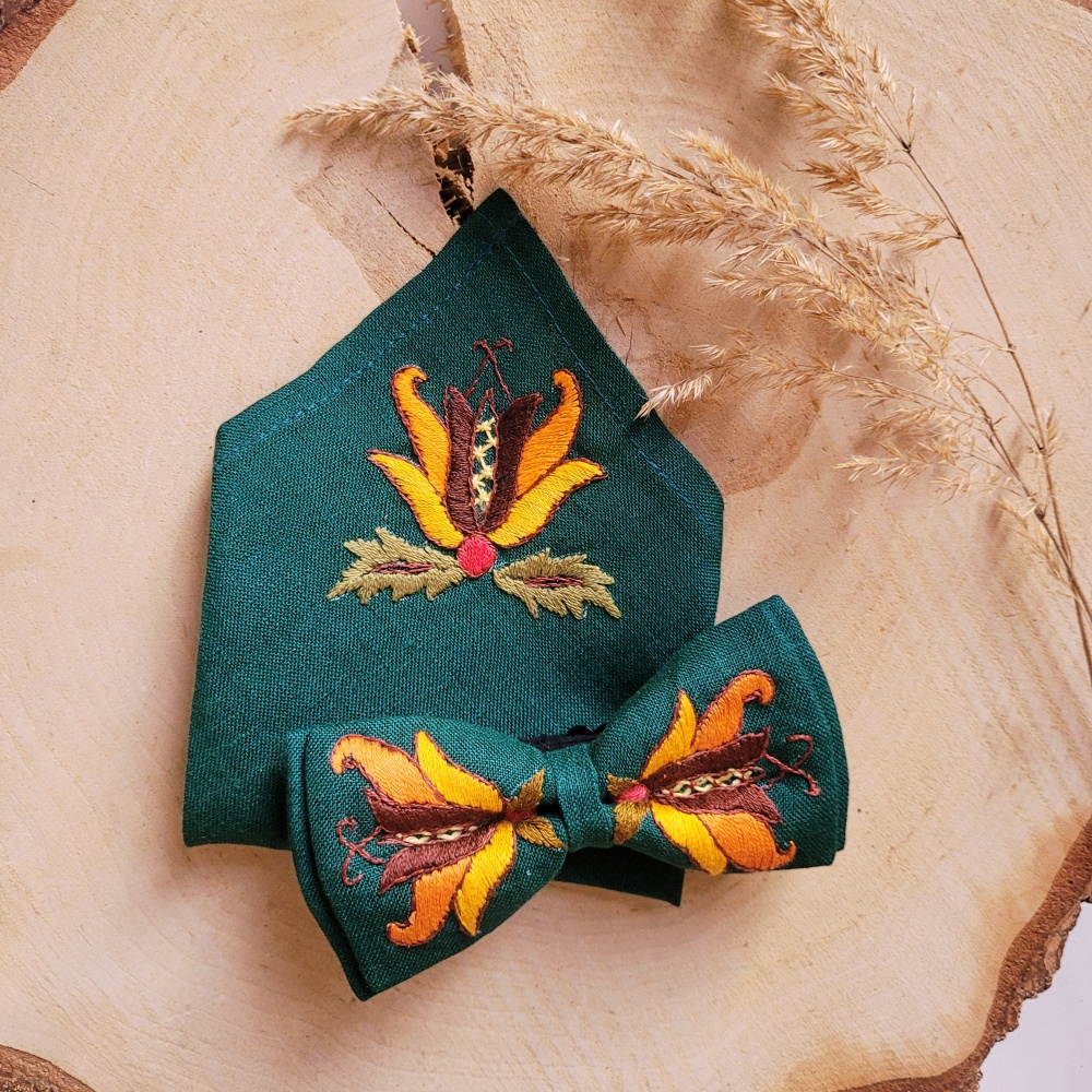 Zestaw: Muszka i Poszetka Lniana z Haftem Ręcznym – Szkoła Borowiacka